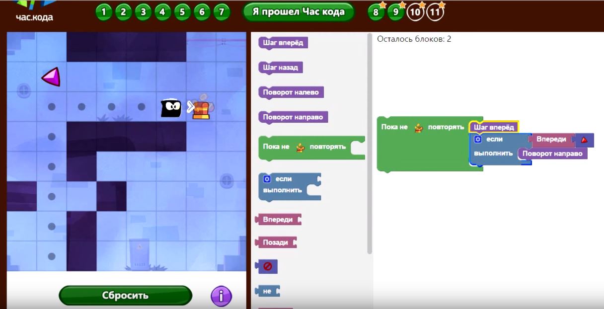 Головоломка представляет из себя два поля на экране. В одном нарисован уровень лабиринта с маленьким человечком и наша задача составить сбоку правильные варианты событий, который основаны на движении. Если вы уже знакомы с геймплеем, то можете смотреть Час кода 2015 ответы, но мы рекомендуем проходить без подсказок, так как головоломка действительно интересная и развивающая.